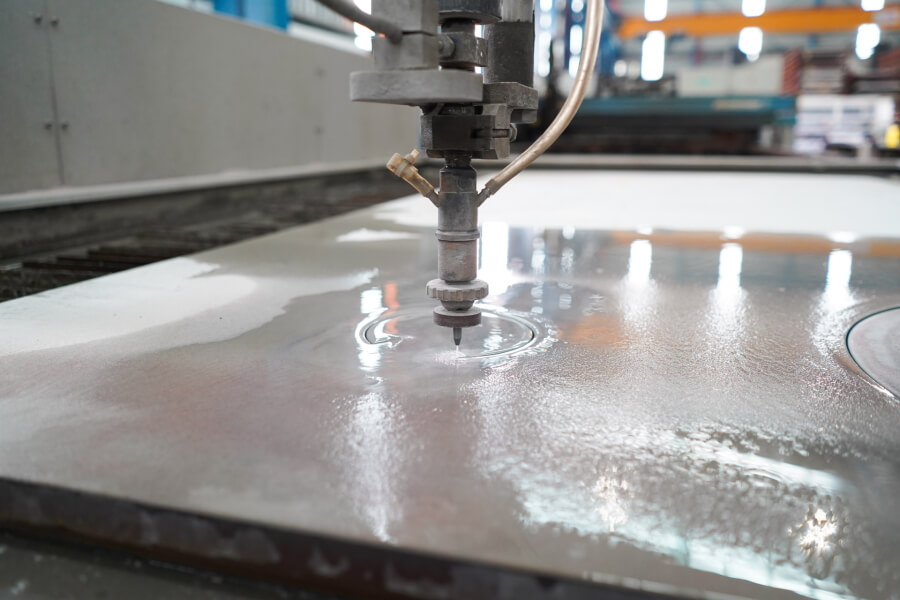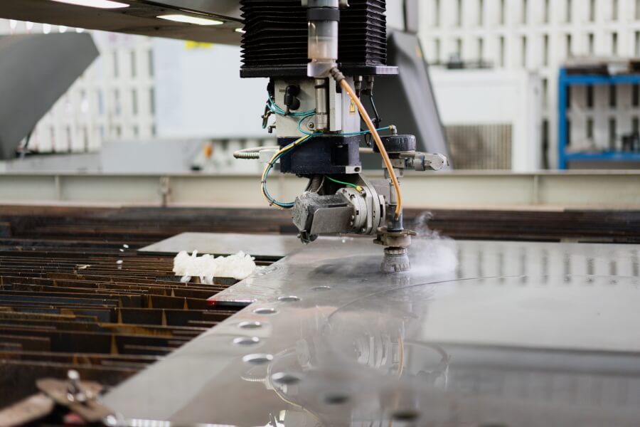 Waterjet cutting machines use a high-pressure stream of water, which is then converted to velocity via a jewel orifice, which then creates a stream as fine as human hair. When using abrasive cutting techniques, garnet, the abrasive material is introduced into the stream to increase pressure, resulting in a cutting velocity that is much faster. It is the preferred method when the materials being cut are sensitive to the high temperatures generated by other methods; examples of such materials include plastic and aluminium.