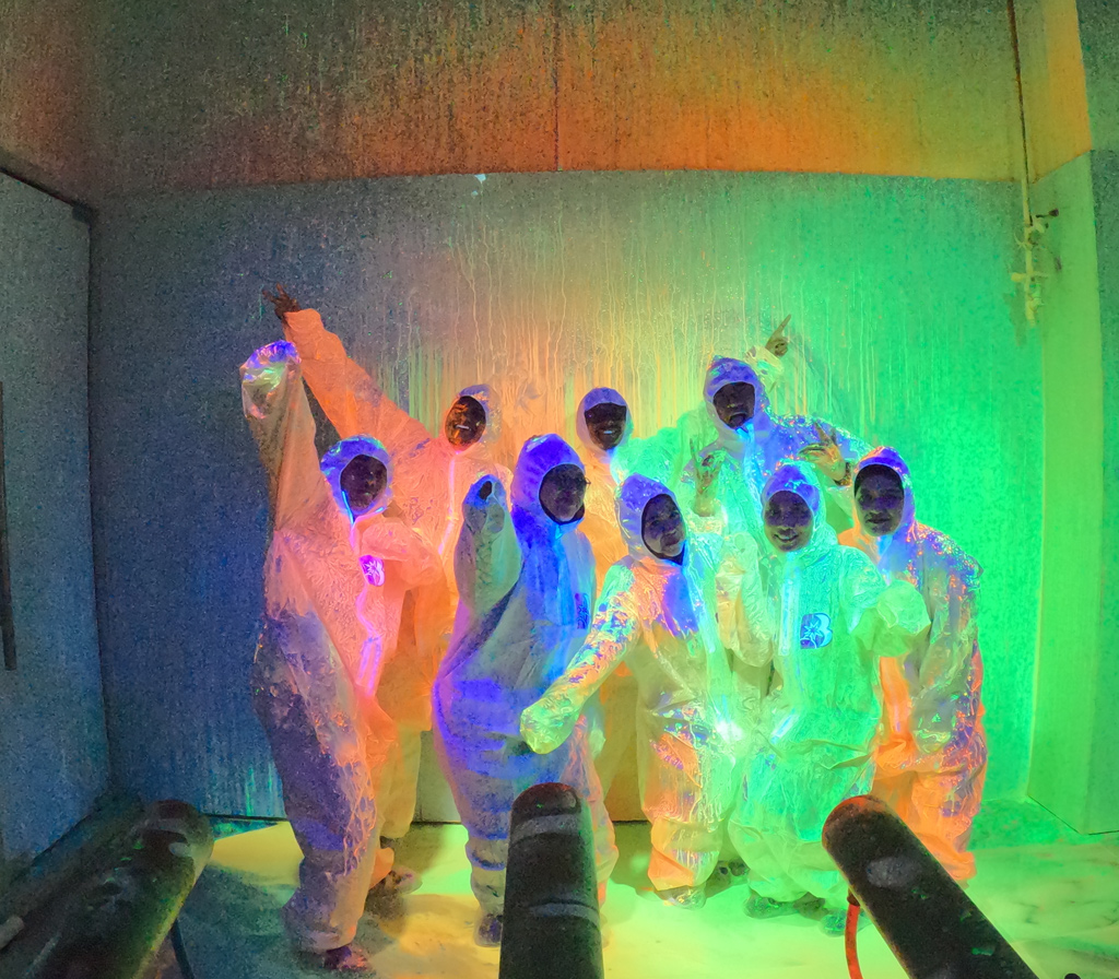 At Bomb Battle, each team tackles 5 collaborative challenges designed to test both mental and physical skills. Two teams of 8, all suited up in hazmat gear, must work together to solve codes and disarm a massive Paint Bomb-or face the consequences of #GETBLASTED!