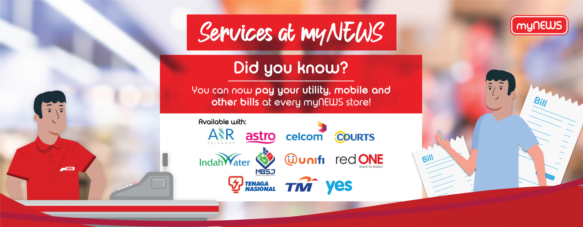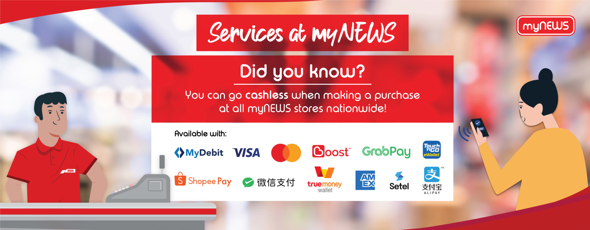 Go cashless and pay with your myNEWS Loyalty Card, credit or debit cards, Alipay, TNG e-wallet and Boost in our stores.
