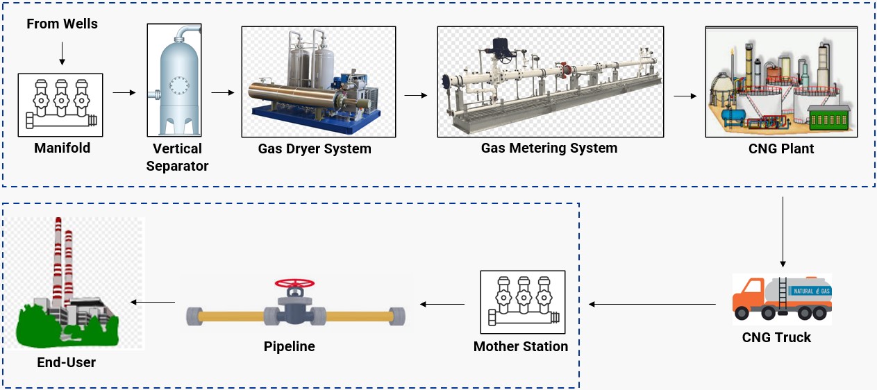 The gas from wells will be collected into a manifold, then come to the separator and the dryer system to achieve the gas sales specification.