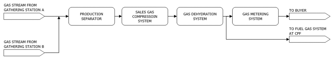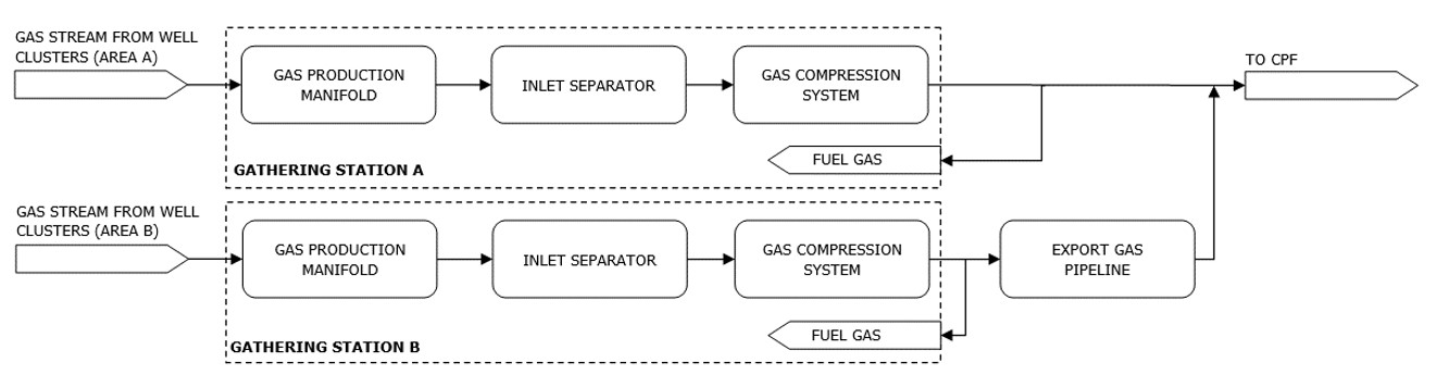 The gas produced from area A and area B will be collected at each Gathering Station A and B. where it will be separated from carried liquid and compressed prior to entering Central Production Facilities (CPF).